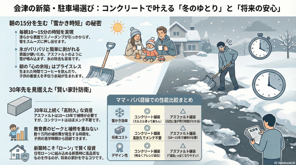 結論から言います。会津で新築を建てる子育て世帯には、駐車場は断然「コンクリート舗装」をおすすめします。